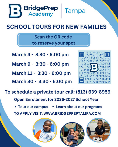 Come and see all BridgePrep Academy of Tampa Campus has to offer. Enrollment is open for students in grades K-8. Our school is small, safe, quaint and has a personal environment. We offer before and after care, a dual language program, a positive behavior system, and much more. Scan the QRcode to reserve your spot ⭐ or follow this link.