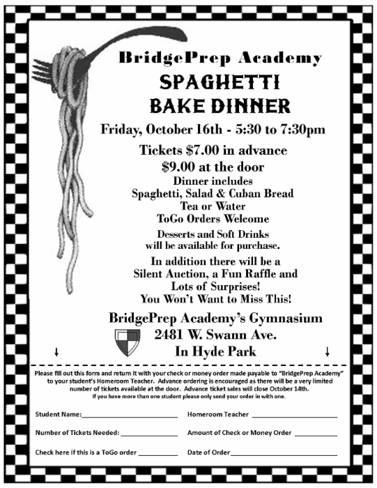 Join us in the BridgePrep Gym from 5:30 to 7:30 PM. Friday October 16th for our Spaghetti Bake Dinner. We will be having a raffle, a silent auction and other fun surprises planned for the evening. Ticket order forms have been sent home with your child! What a Great way to have a family fun night and support our school! See you there!
