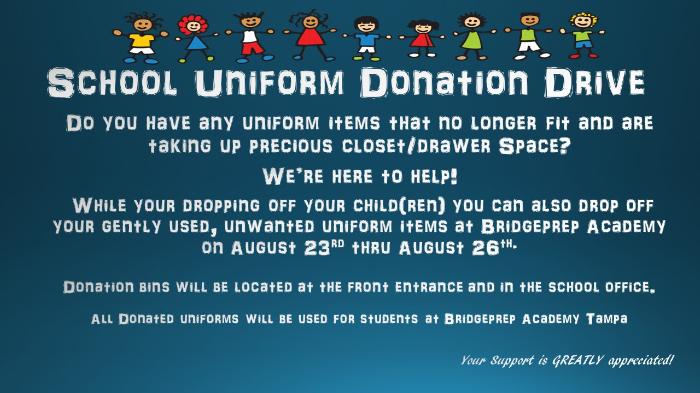 Dear BridgePrep Families, We will be having a uniform donation drive. Join us and help your Bridgeprep Family!!